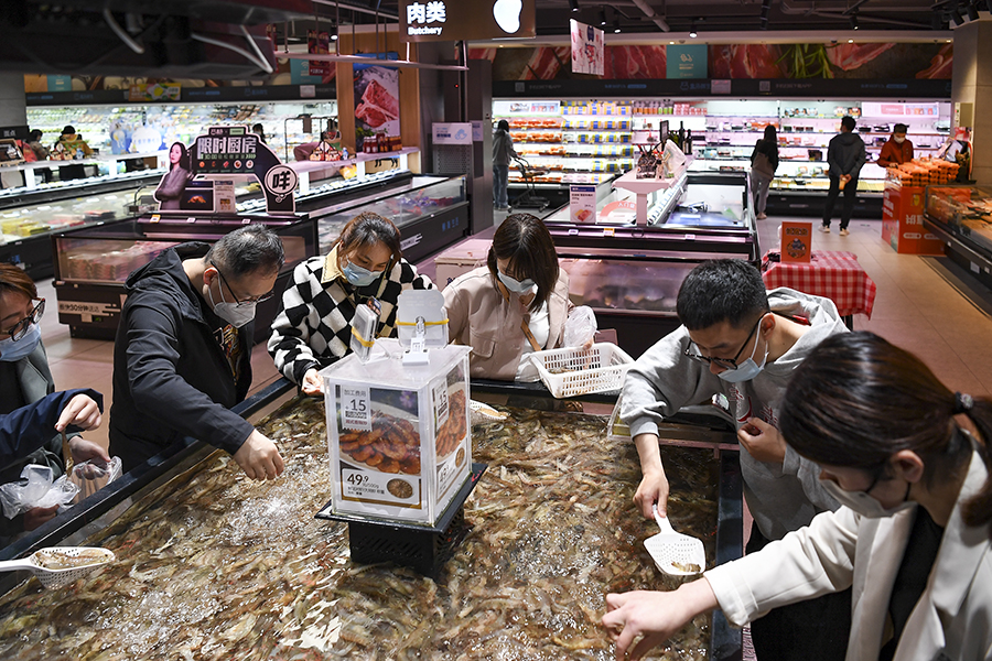 4月30日,长沙市雨花区盒马鲜生喜盈门店,市民在选购大明虾。“五一”假期,长沙主要生活必需品市场供应品种齐全,商品供应充足,各大商业综合体纷纷抓住商机,推出多品类、多形式的促销活动,激发市民消费热情。 湖南日报全媒体记者 辜鹏博 通讯员 张玉 摄影报道