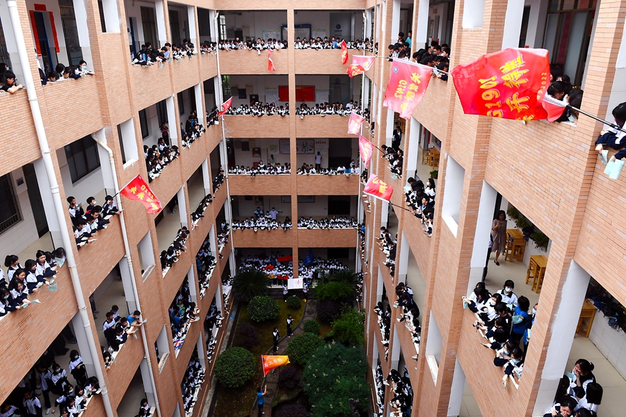 5月24日,长沙市麓山滨江实验学校组织高一、高二年级学生通过“喊楼”的形式,为即将参加高考的学子加油、助威! 湖南日报全媒体记者 徐行 通讯员 姜欣 摄影报道
