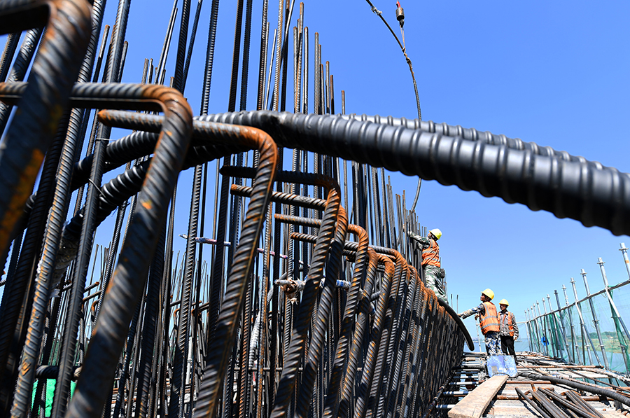 8月9日上午,湖南路桥建设集团长沙香炉洲大桥项目现场,施工人员在绑扎主墩钢筋。从本月初开始,该项目全面进入上部构造施工。面对高温天气,项目部采取了防暑降温措施,设置了3个工人驿站,配备了凉茶和防暑降温药品,同时避开高温时段作业,在确保安全的前提下推进施工建设。 湖南日报全媒体记者 田超 摄