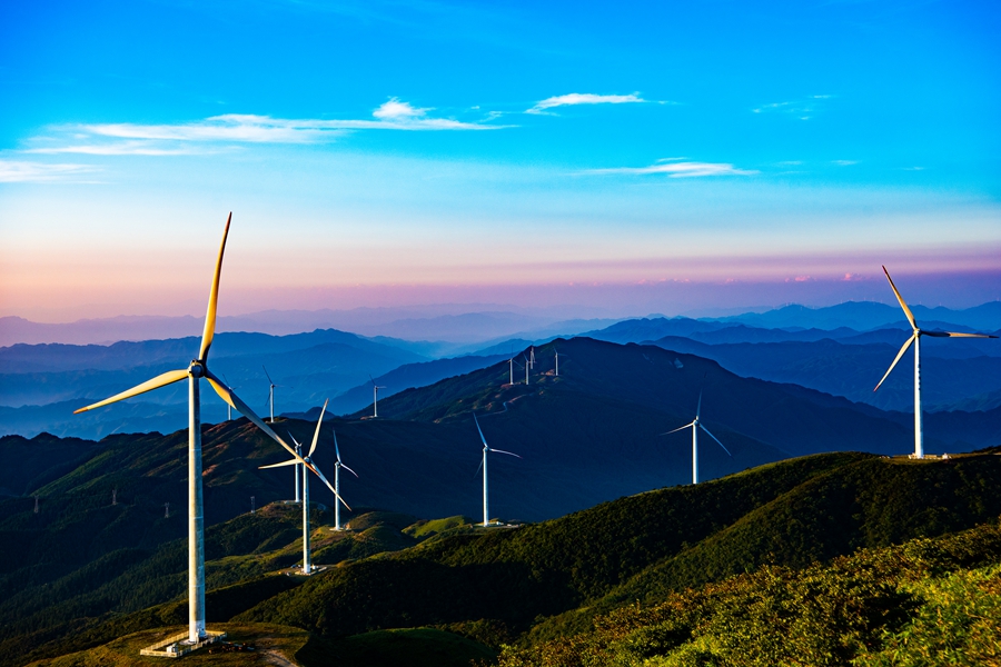 8月20日,洪江市苏宝顶风电场,一台台风力发电机矗立在雪峰山上,与蓝天、白云、青山相映成景。近年来,该市坚持绿色发展理念,发展风电产业,助推县域经济发展。田文国 摄