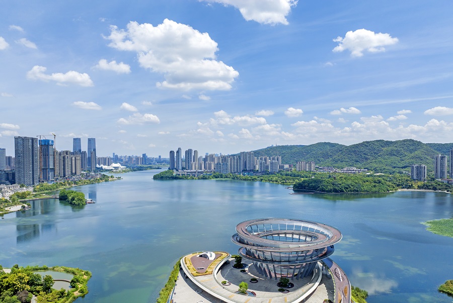 8月27日,长沙市梅溪湖碧波荡漾,与蔚蓝的天空交相辉映,构成了一幅水天一色的生态画卷。近年,长沙市坚定不移走生态优先、绿色发展之路,全力打好污染防治攻坚战,环境质量稳步提升。湖南日报全媒体记者 李健 摄