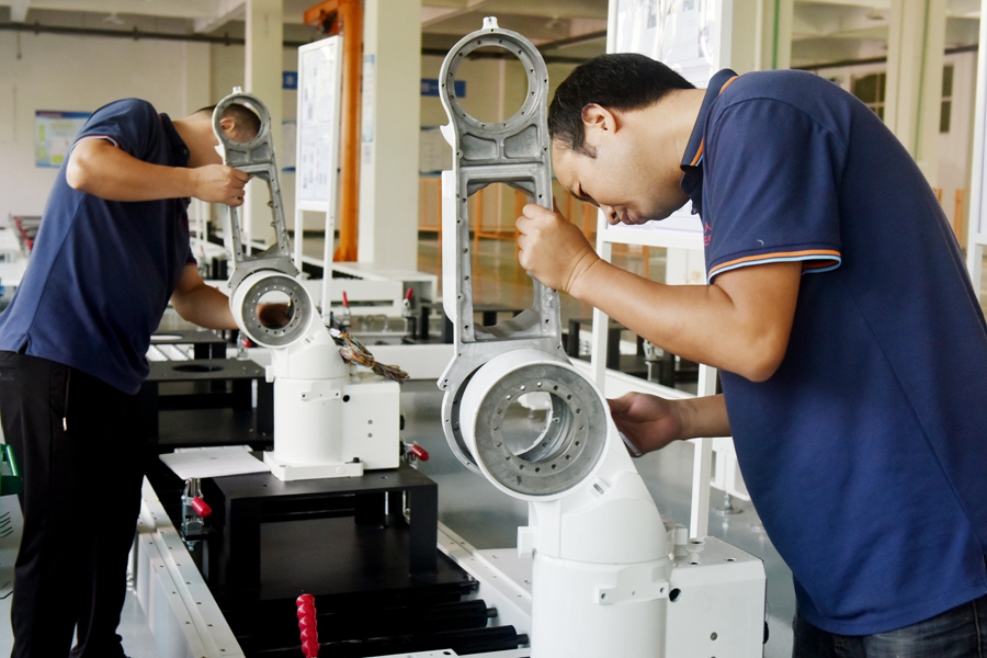 9月5日,怀化高新区大研智能机器人有限公司工人在安装六轴工业机器人。该公司主营工业机器人的研发、安装、维修和特殊作业机器人制造,预计年产5000套重载工业机器人、12万套协作机器人关节等产品。当天,该公司进入试生产。吴湘怀 摄