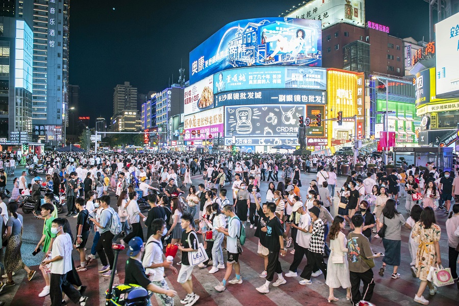 10月1日晚,长沙市五一商圈人头攒动,“网红”长沙吸引大批游客前来游玩、购物。湖南日报全媒体记者 李健 摄