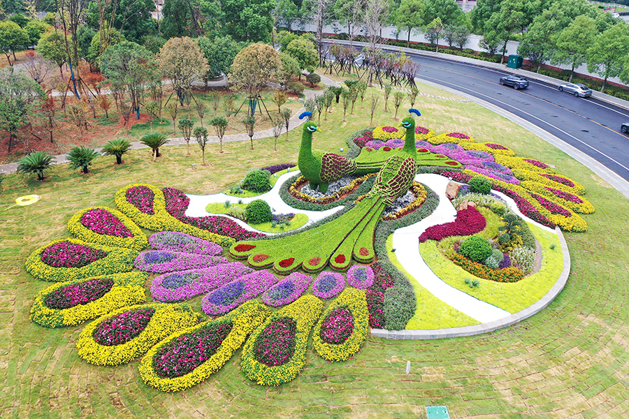 10月6日,长沙市三一大道湖南国际会展中心附近匝道,两只“孔雀”深情对视。国庆假期,长沙城区共布置大型主题雕塑、立体花雕、花镜式造景、地面摆花等园林景观50处,烘托出浓厚的节日氛围。 湖南日报全媒体记者 田超 摄