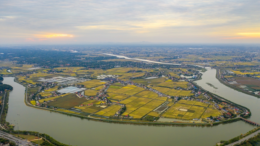 10月10日,长沙市望城区乌山街道团山湖村高标准农田里,成片的晚稻喜获丰收,金黄的稻子与沩水、民居、村道等相映成趣,构成一幅美不胜收的乡村丰收画卷。湖南日报全媒体记者 辜鹏博 摄