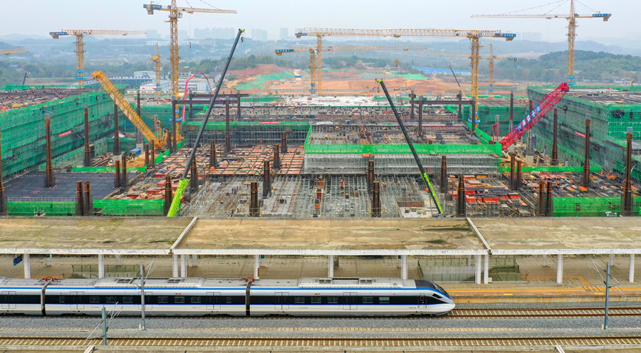 12月8日,长沙高铁西站站房项目现场,建设者正在抓紧建设施工。目前,高铁站房工程项目总体基础施工已完成90%,项目预计于2026年建成投运。湖南日报全媒体记者 郭立亮 摄