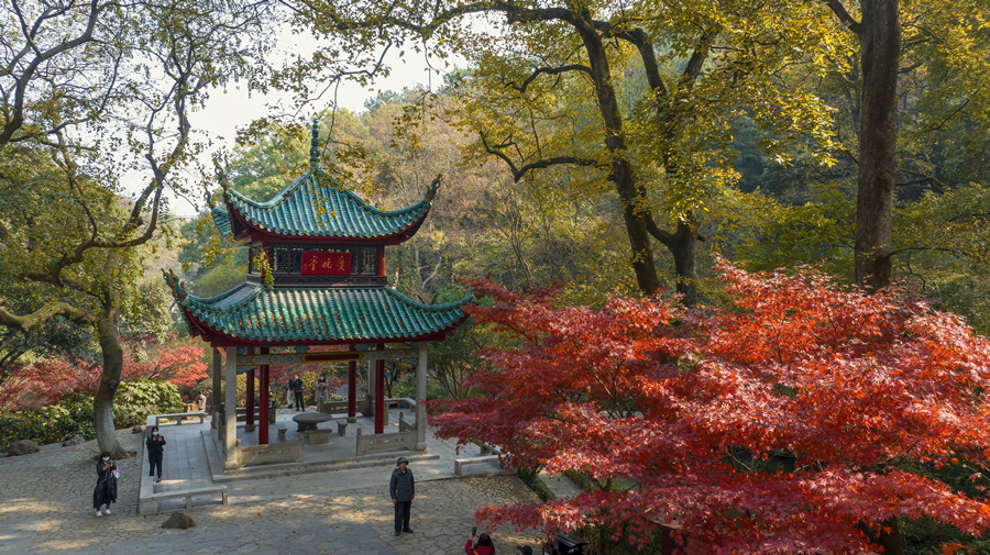 12月12日,游客在爱晚亭打卡拍照。仲冬时节,长沙岳麓山景区迎来一年中最美的时节,大片的枫叶泛红,银杏转黄,美景如画。湖南日报全媒体 记者 辜鹏博 摄