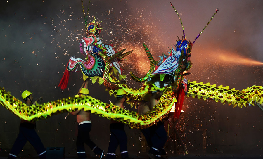 2月23日晚,吉首市乾州古城万溶江畔,民间艺人在表演“钢火烧龙”。当天,该市首届旅游发展大会暨第九届吉首鼓文化节活动之“钢火烧龙”非遗民俗表演在乾州古城水上舞台举行,彩龙飞舞,“钢花”绽放,吸引众多市民和游客前来观赏。姚方 摄
