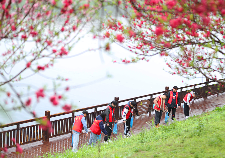 3月19日,大学生志愿者在捡垃圾。当天,南华大学土木工程学院“保护母亲河青年志愿者服务队”开展以“携手共护母亲河”为主题的志愿服务活动。志愿者来到湘江衡阳市东洲岛段,捡垃圾、检测水质,净滩护水。 曹正平 摄