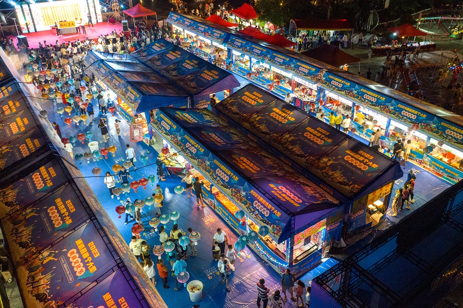 5月28日晚,通道侗族自治县萨岁广场举办美食文化节,吸引众多市民和游客购物。今年,该县把促进消费复苏、释放内需潜力摆在优先位置,通过举办乡村旅游节、美食文化节、民俗音乐节等活动,带动县域经济发展。李尚引 摄
