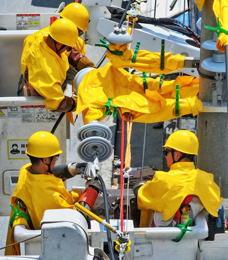 7月5日,怀化市洪江管理区回龙寺社区,工作人员在10千伏洪横Ⅰ线021号杆进行不停电检修作业。近期持续高温,国网怀化供电公司组织了12支带电作业队伍检修电网,确保安全供电。胡浩 摄