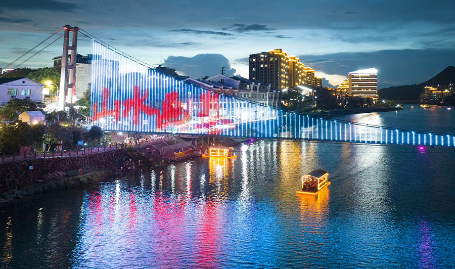7月21日傍晚,凉风习习,游客乘船欣赏资兴市东江两岸夜景。近年,该市不断改进完善城市配套设施,打造“东江花月夜”文旅项目,让城市的夜晚“亮”起来、人气“热”起来、经济“旺”起来 。 湖南日报全媒体记者 辜鹏博 通讯员 廖智慧 摄影报道