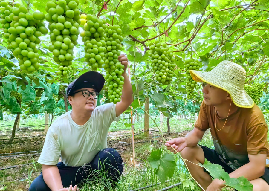 8月5日,长沙县干杉镇葡萄种植基地,湖南农业大学葡萄种植团队的师生在观察葡萄长势。这支由财政部和农业农村部组建的科学家团队,主要进行葡萄品质风味的形成、葡萄熟期调控和特色葡萄资源开发等方面的研究,为我省葡萄种植产业引进了维多利亚、美人指、醉金香、夏黑、阳光玫瑰等上百个品种。