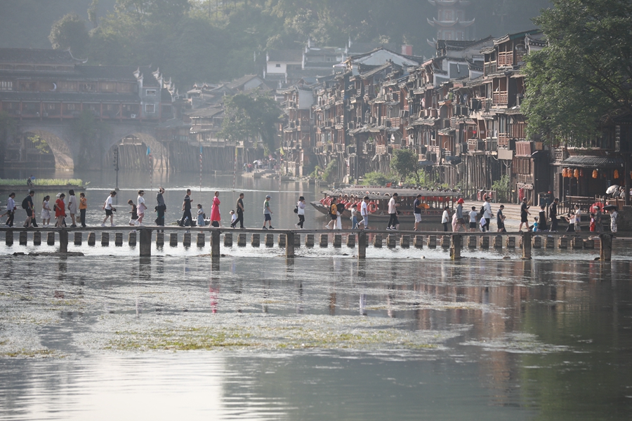 8月5日,众多游客来到凤凰古城参观游览,乐享假期。 彭彪 摄