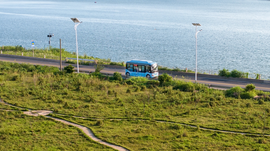 9月18日,长沙市天心区,一辆乡村公交车行驶在湘江风光带。近年来,长沙市交通运输局打通乡村振兴的“毛细血管”,织密美好乡村幸福网,实现“村村通公交”。 湖南日报全媒体记者 辜鹏博 摄