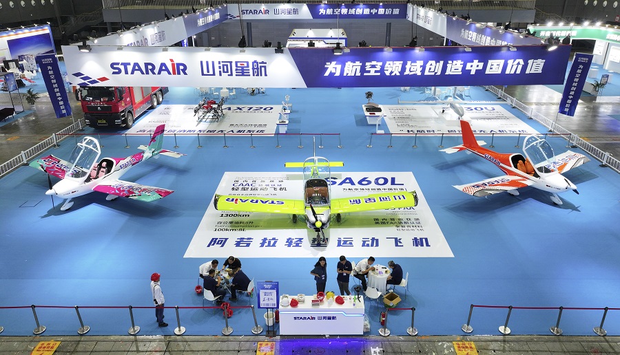 9月21日,长沙国际会展中心,山河星航展区已基本布置完毕。2023湖南(国际)通航产业博览会静态展于9月22日至24日举行,展览面积7万余平方米,设置通航制造、通航应用、通航科普等展区。21个省(区、市)组团参展参会,参展企业超过300家,包括航天科技、航天科工等22家央企,大疆、华为、小鹏以及巴西航空工业、贝尔、荷兰莱特兄弟、罗宾逊等国内外26家行业头部企业。湖南日报全媒体记者 辜鹏博 摄