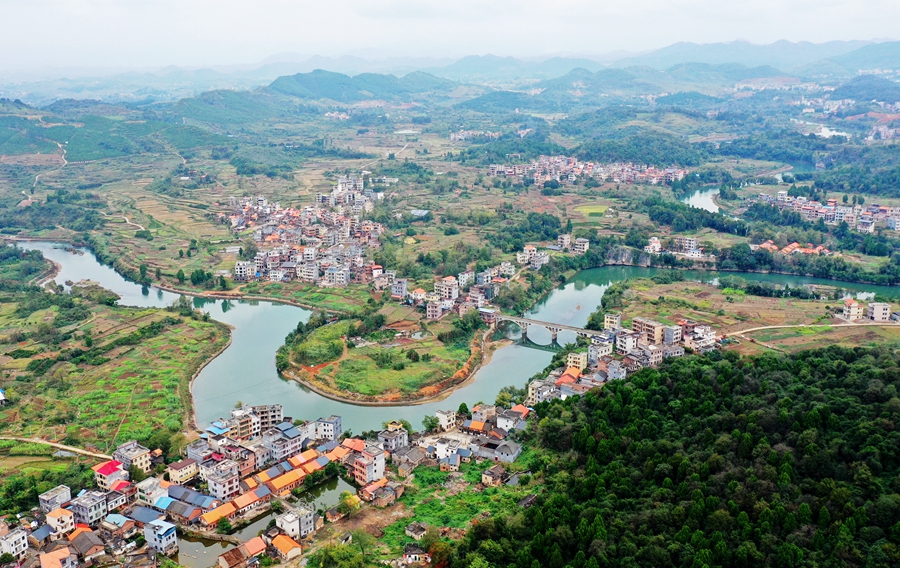 11月6日,嘉禾县石桥镇,蜿蜒的舂陵河与两岸民居相互映衬。近年,该县加大美丽乡村建设,因地制宜发展绿色、生态富民产业,创造宜居宜业的乡村生态环境。 黄春涛 摄