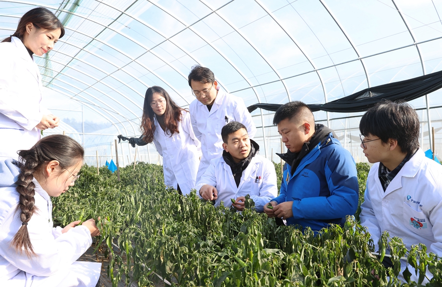 受低温天气影响,长沙县春华镇九木村蔬菜大棚内的辣椒近日出现大面积冻死冻伤。12月22日,湖南农业大学园艺学院师生来到该村开展实践课堂,指导种植户科学应对天气变化。 湖南日报全媒体记者 赵持 通讯员 陈俊睿 摄影报道