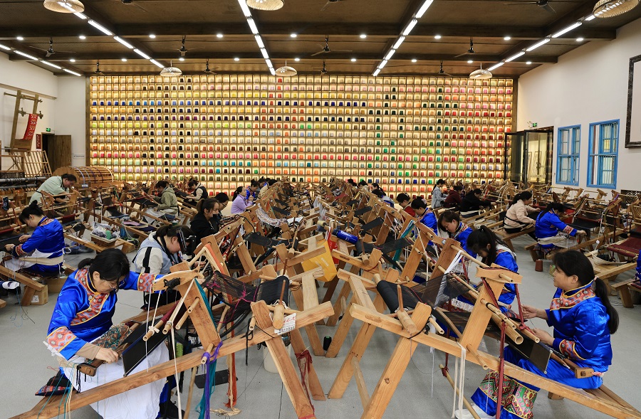4月10日,张家界市武陵源区乖幺妹土家族织锦生产研发基地,工人在制作土家族织锦产品。旅游旺季来临,武陵源区土家族织锦企业根据市场订单设计生产背包、壁画等个性化的土家族织锦产品,满足国内外游客需求。吴勇兵 摄