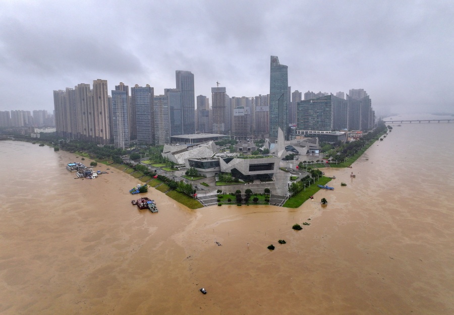 6月27日,俯瞰长沙市开福区新河三角洲湘江长沙段。当天4时52分,湘江长沙站出现洪峰水位37.14米,超警戒水位1.14米。7时57分水位开始回落,本次洪峰已平稳通过湘江长沙站。