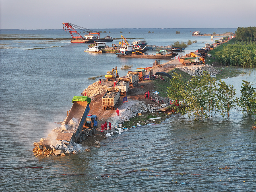 7月7日,华容县团洲垸决口封堵现场,抢险力量正采用船抛石料、双向“进占”、碎石和块石联合填埋等方式,加快封堵进度。