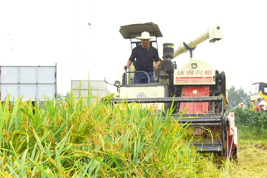7月10日,澧县梦溪镇梦江桥村,村民驾驶收割机收割早稻。盛夏时节,当地村民忙着抢收早稻、翻耕稻田、栽插晚稻,有序开展“双抢”作业。 柏依朴 摄(湖南图片库)