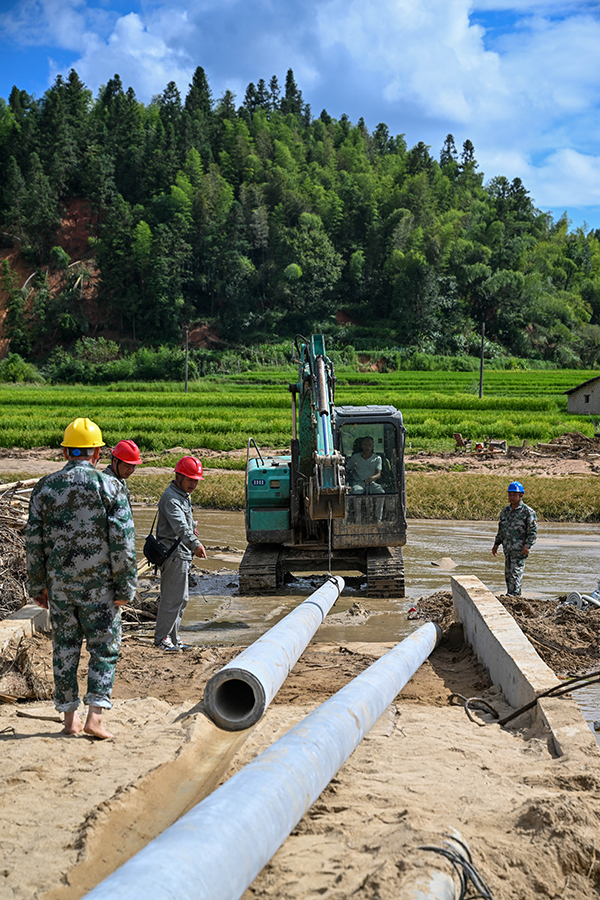 8月1日,武警官兵在开展清淤作业。当天,武警湖南总队郴州支队出动70余名兵力,前往资兴市八面山瑶族乡018县道帮助当地群众清理淤泥。 张森 摄(湖南图片库)