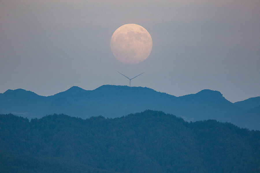 9月17日,龙山县大灵山风力发电场,一轮圆月缓缓升起。今年中秋,因满月正好出现在近地点附近,一轮明亮硕大的“超级月亮”,为这个传统节日增添更多浪漫色彩。 曾祥辉 摄(湖南图片库)