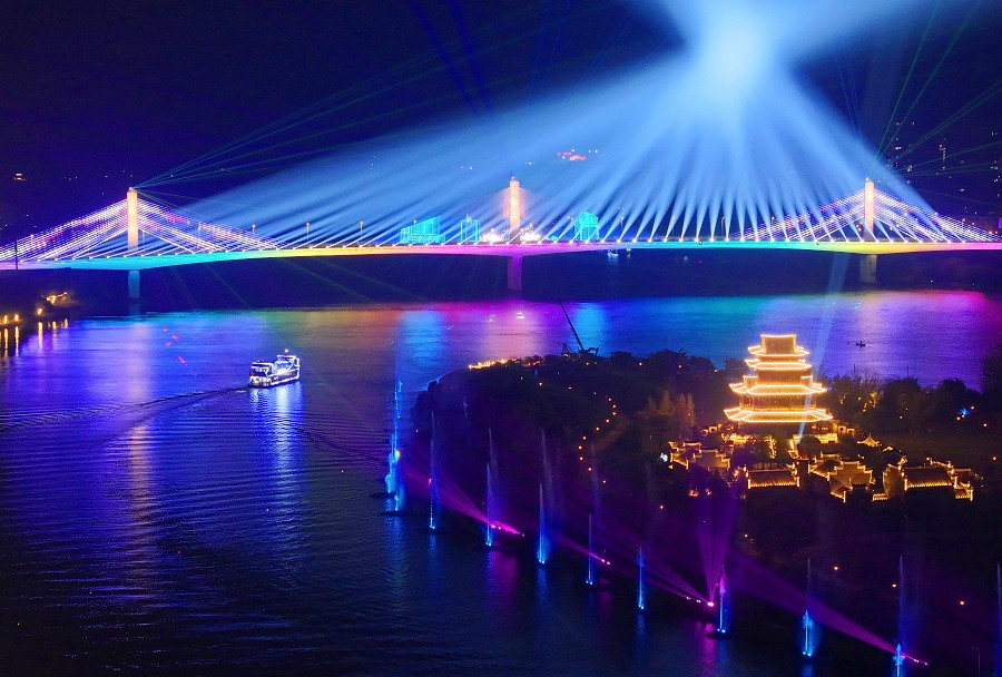 9月19日,兴洲号夜游湘江船行驶在衡阳市湘江东洲岛段璀璨的夜色里。第三届湖南旅发大会即将在衡阳举行,该市湘江两岸东洲岛到石鼓书院段的美化亮化工程全面竣工。曹正平 摄(湖南图片库)