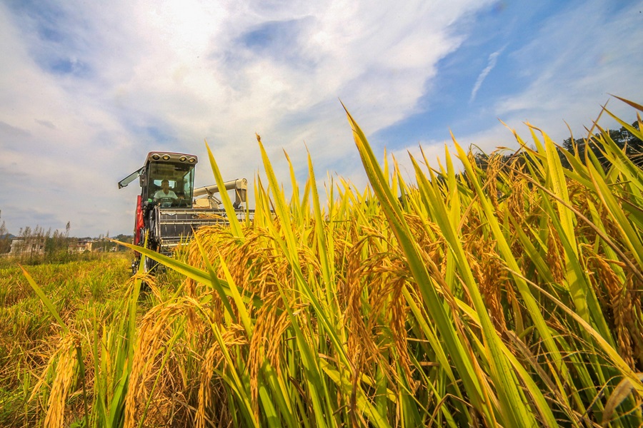 9月20日,龙山县石羔街道干比社区,农民驾驶收割机抢收水稻。中国农民丰收节将至,该县农民抓紧晴好天气抢收水稻,确保颗粒归仓。曾祥辉 摄