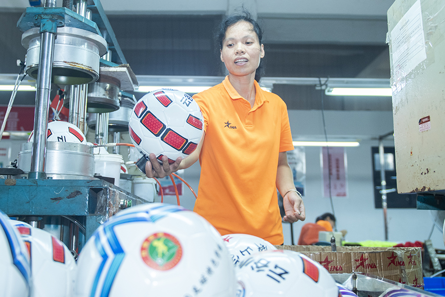 9月27日,娄底经开区湖南茵浪体育股份有限公司,工作人员在生产足球,赶制海外订单。该公司是一家省专精特新中小企业,其生产的足球、球衣及体育装备产品主要出口非洲。 吴永华 摄(湖南图片库)
