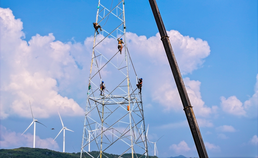 9月28日,宁夏-湖南±800千伏特高压直流输电线衡阳接地极线路施工现场,电力工人在加紧施工。该项目建成后将进一步满足沿线区域用电供给。周秀鱼春 摄(湖南图片库)