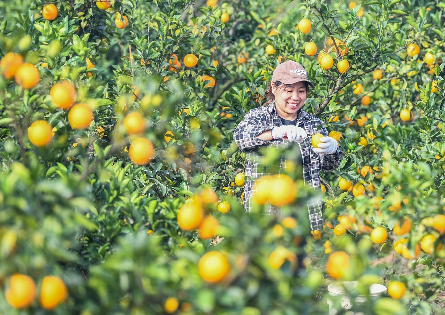 11月3日,道县东门街道新立村,果农在采收脐橙。近日,该县21.7万亩脐橙进入成熟期,果农抓紧采收供应市场。近年来,道县引导农民通过“党支部 基地 农户”模式,规模化、标准化、品牌化发展脐橙种植,推动脐橙产业成为村民增收致富的绿色产业。蒋克青 摄(湖南图片库)