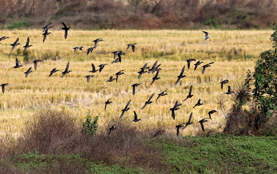 11月26日,长沙市望城区丁字湾街道,一群野鸭从空中飞过。望城区生态环境良好,有不少候鸟前来过冬。 湖南日报全媒体记者 张京明 摄