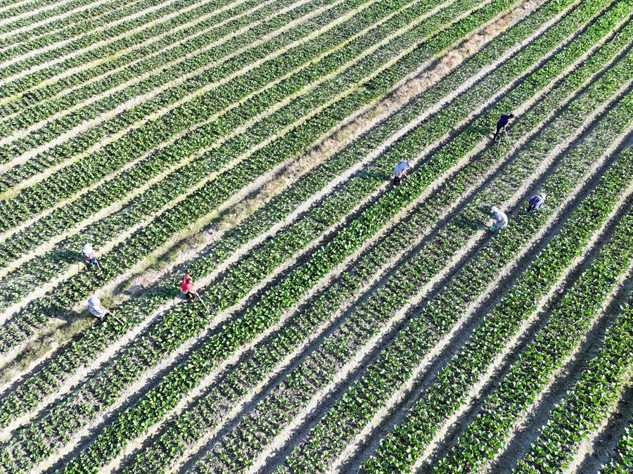 12月2日,道县清塘镇濂溪大洞蔬菜基地,菜农在管护蔬菜。近年来,该县采取“公司+合作社+农户”模式,规模化、菜稻轮作种植各类绿色生态蔬菜,产品直供粤港澳大湾区,促进农民增收,助力乡村振兴。 何红福 摄(湖南图片库)