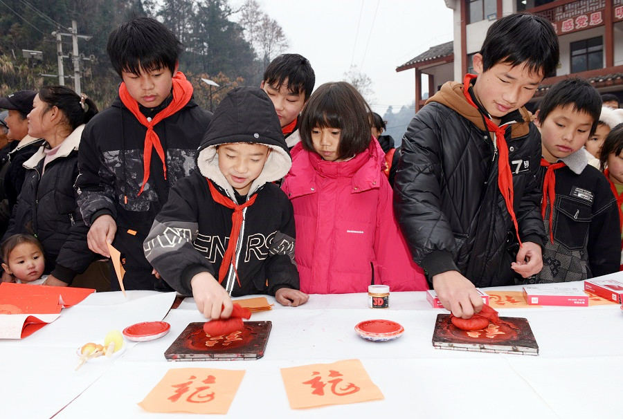 12月29日,吉首市丹青镇樟武村,小朋友在拓印“福”字。当天,该市关工委与市公共汽车公司联合举办“庆元旦迎新年”活动,志愿者与苗家孩子们一起写对联、唱苗歌、送“福”字,喜迎新年的到来。姚方 杨燕萍 摄影报道(湖南图片库)