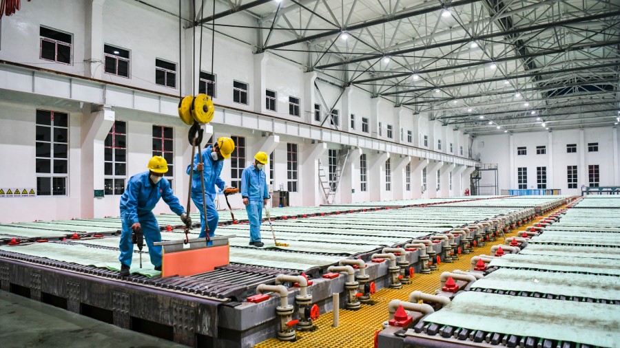 1月3日,常宁市五矿铜业(湖南)有限公司电解厂生产车间,工人在施工作业。新年伊始,该市各工业企业开足马力加紧订单生产,力争实现新年“开门红”。周秀鱼春 摄(湖南图片库)