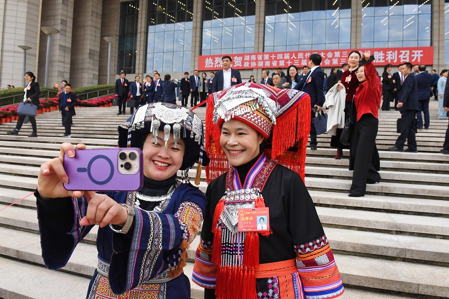 1月14日上午,湖南省第十四届人民代表大会第三次会议开幕会后,两位少数民族代表在会场外合影留念。湖南日报全媒体记者 徐行 摄