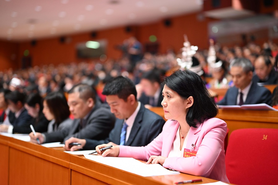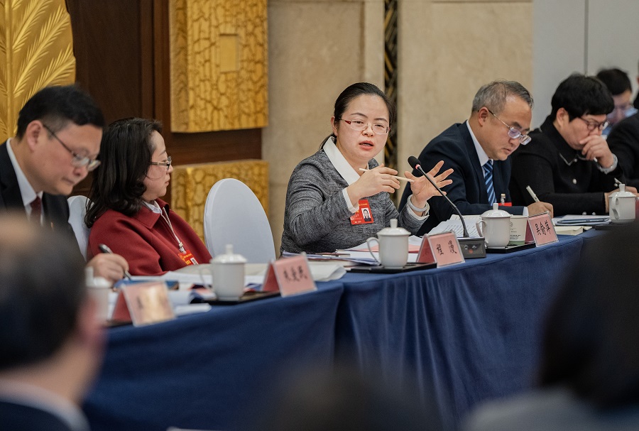 1月14日下午,张家界市代表团吴俞萍代表(中)就加快推进溹水生态补水建设,满足游客、群众用水需求建言。湖南日报全媒体记者 李健 邹尚奇 摄影报道
