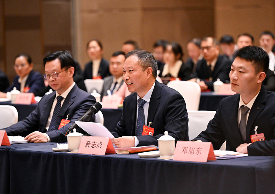 1月16日下午,益阳市代表团薛志成代表(前排左二)就加强装配式建筑与竹产业发展建言。 湖南日报全媒体记者 唐俊 摄