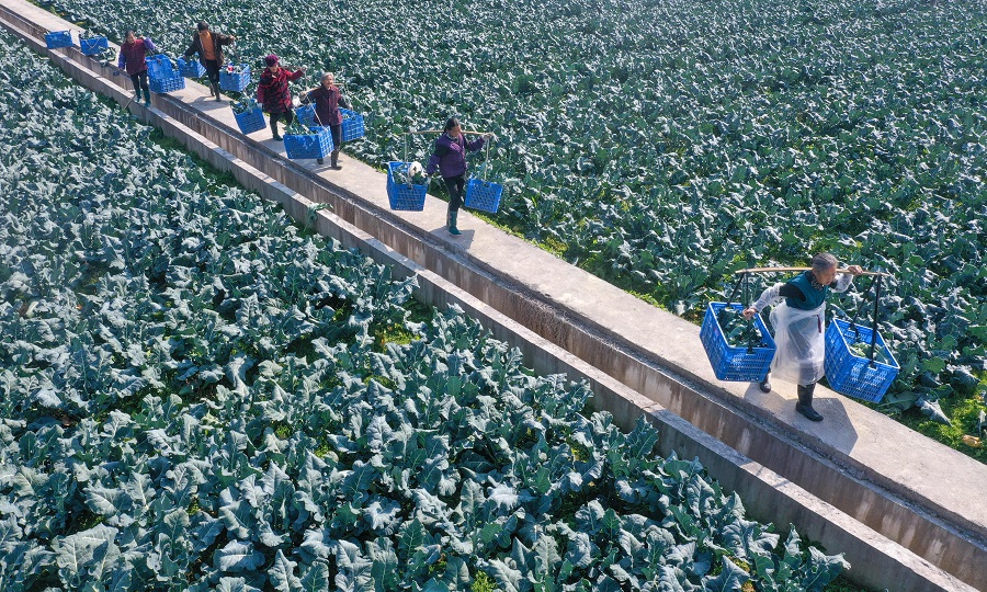 1月19日,隆回县花门街道太平洲村富硒蔬菜产业园种植基地,村民在搬运西蓝花。近日,该基地的蔬菜进入成熟采摘期,村民正忙着采摘、分拣,发往粤港澳地区,供应春节期间蔬菜市场。曾勇 摄(湖南图片库)