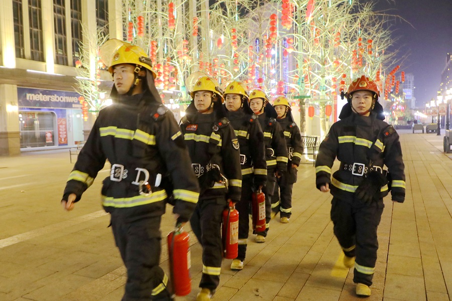 1月28日晚,消防员手提灭火器在常德步行街巡逻。当晚,常德市消防救援支队在全市成立25个巡逻小分队,对全市重点场所进行现场值守、流动巡查,确保除夕之夜的消防安全。陈自德 摄