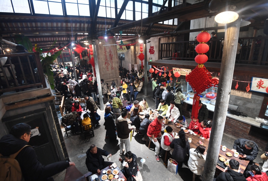 2月1日,游客在休闲聚会、品尝茶点小吃。春节期间,长沙东茅街茶馆举办“东茅街春早——非遗过大年”活动,整合民俗文化、街道邻里文化、市井茶馆文化等,尽显老长沙过年韵味。湖南日报全媒体记者 田超 摄