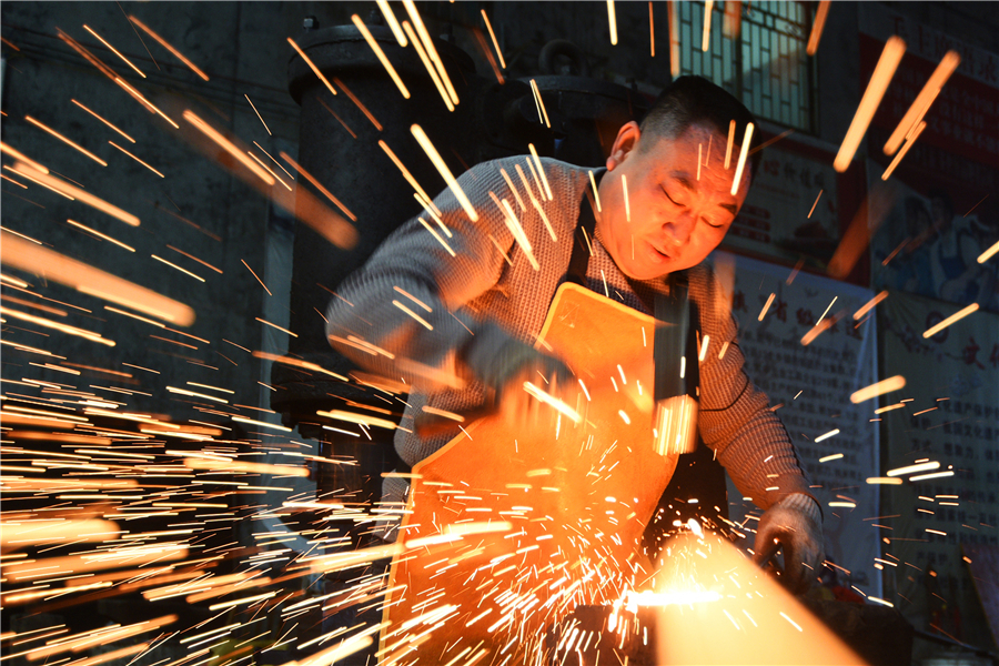 2月21日,嘉禾县塘村镇一家锻造作坊,铁匠在手工打制传统农具。 黄春涛 摄(湖南图片库)