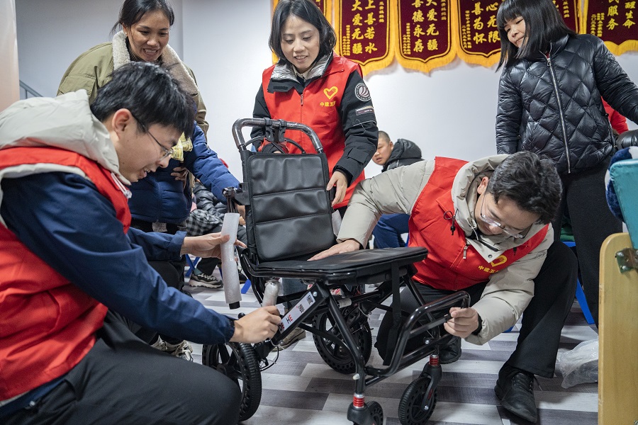 3月3日,长沙县慢天使残疾儿童公益服务中心,志愿者帮助孩子调试新轮椅。当天,中建五局土木公司开展“学雷锋 关爱慢天使 实现微心愿”志愿服务活动,为孩子们送上自行车、电话手表、轮椅以及特制运动鞋等爱心物资。