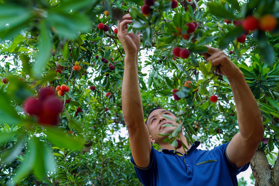 5月25日,宜章县玉溪镇水浸窝村,游客在杨梅基地采摘杨梅。近年来,当地依托良好的地理环境,种植杨梅10000余亩,同时将休闲观光旅游与农业产业融合,带动农户增收致富。邓加亮 摄