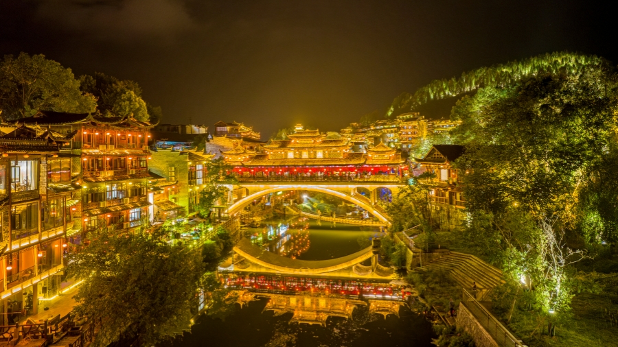 9月22日晚,永顺县芙蓉镇景区灯光璀璨,瀑布与古建筑在灯光映衬下相得益彰。近年来,该景区发展夜经济,打造沉浸式夜游体验,推动文旅产业蓬勃发展。 湖南日报全媒体记者 童臻熙 摄