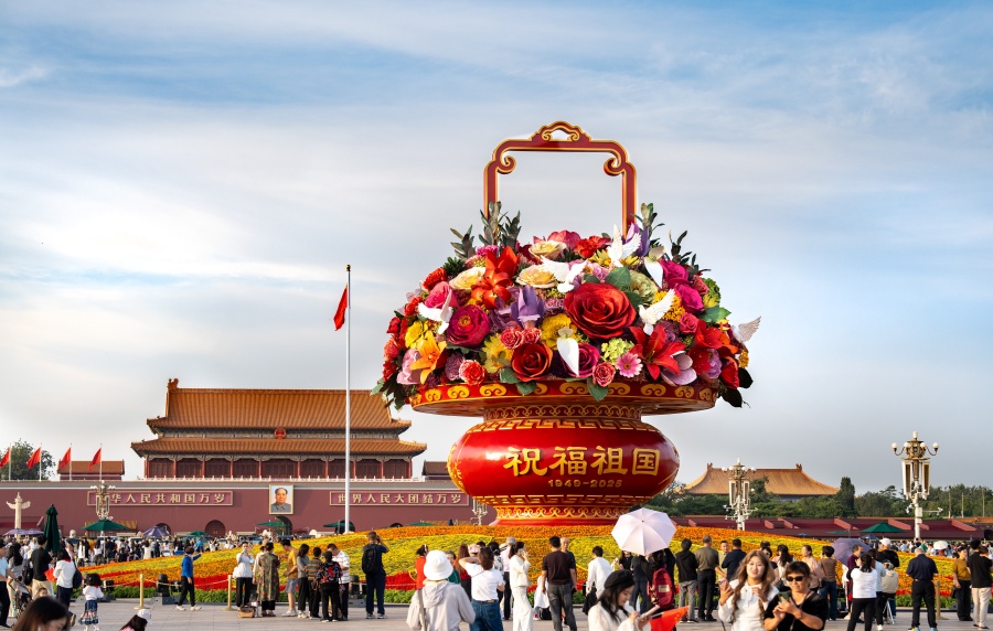 9月25日,2025年“祝福祖国”巨型花篮亮相天安门广场。今年“祝福祖国”花坛以喜庆的花篮为主景,花篮精选荷花等寓意美好的花卉,结合和平鸽、橄榄枝等元素,象征“和平发展、欣欣向荣”。湖南日报全媒体记者 辜鹏博 周帙恒 摄影报道