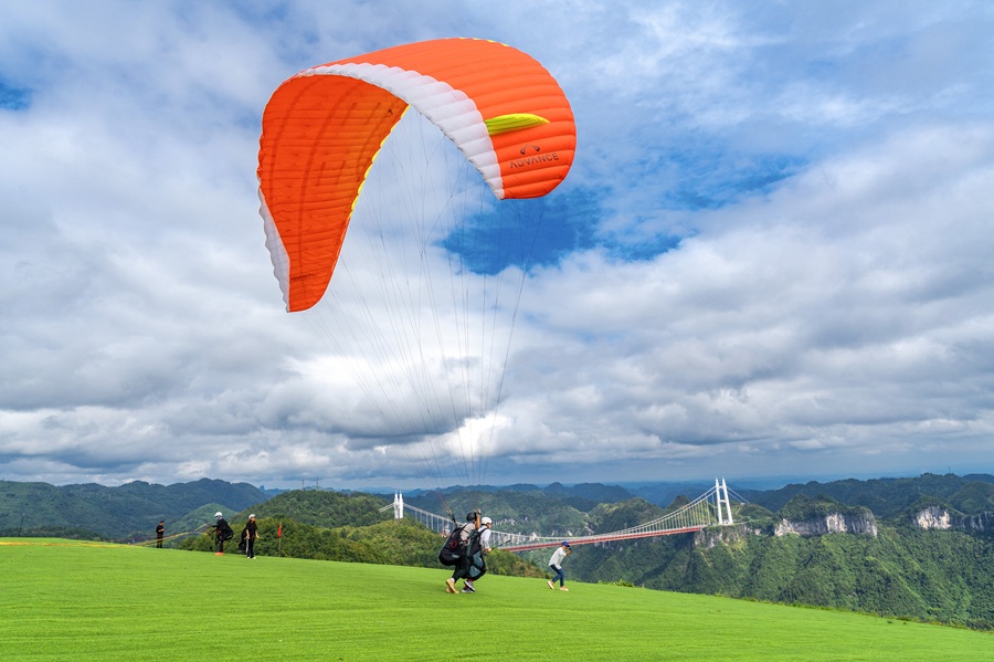 9月27日,吉首市矮寨风景名胜区滑翔营地,游客前来体验空中俯瞰矮寨大桥和苗岭大峡谷的独特视角。为迎接国庆、中秋假期,景区升级营地设施,通过直播引流等方式吸引游客,带动当地文旅消费热潮。梁永鸿 摄