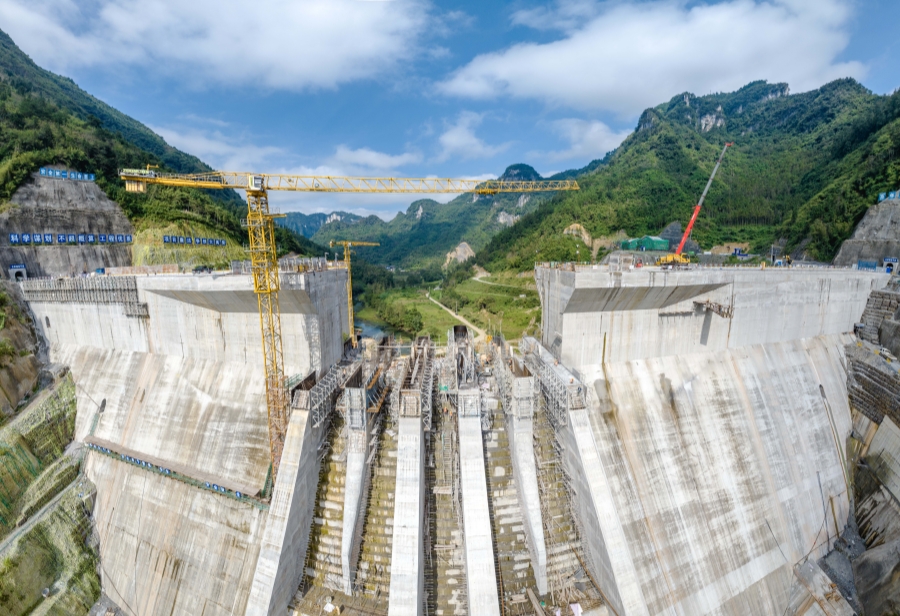 10月4日,吉首市矮寨镇大兴寨水库工程建设现场,工人正在施工。国庆假期,建设者们放弃休假,坚守岗位,全力推进这一重点水利工程建设。 彭璟 摄(湖南图片库)